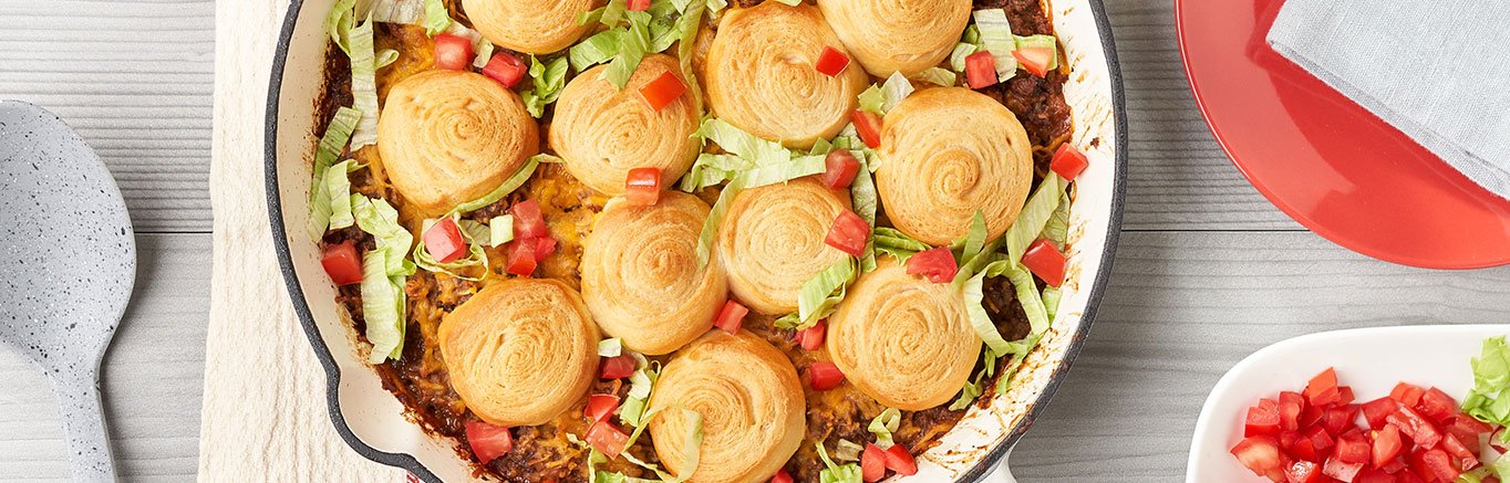 Read moreReady for a weeknight revolution? Our Hamburger Pie transforms your dinner table into a burger joint in just 30 minutes. Packed with golden crescent rolls, riced cauliflower, and bubbling Cheddar cheese, this one-skillet wonder features the familiar flavors of your favorite burger- with an extra savory boost courtesy of cream of mushroom soup. Top with shredded lettuce and diced fresh tomato before serving for the perfect burger experience.