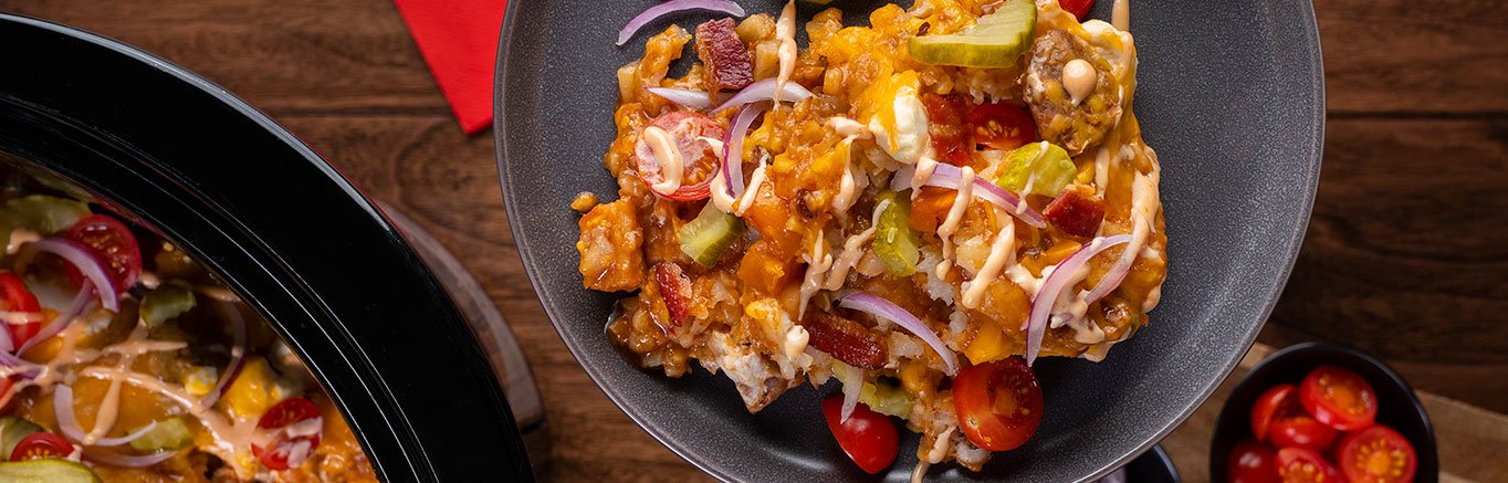 Read moreCan you make a hearty, cheesy, cheeseburger casserole with only 5 minutes of prep time? Yes! This Spicy Slow Cooker Cheeseburger Casserole recipe is kind of magical- you just layer 5 ingredients in the slow cooker, cover and come back in a few hours and it's ready for your game day buffet! Spicy sirloin burger soup makes this version the easiest- there's no need to cook ground beef when there are perfect little burgers right in the soup! Layer with frozen hash brown patties (they go in right from the freezer!), Cheddar and cream cheeses and a little pickle juice. Layers of soup, potatoes and melty cheese make this Spicy Slow Cooker Cheeseburger Casserole perfect as is, but you can top it with your favorite burger toppings to make it your own!