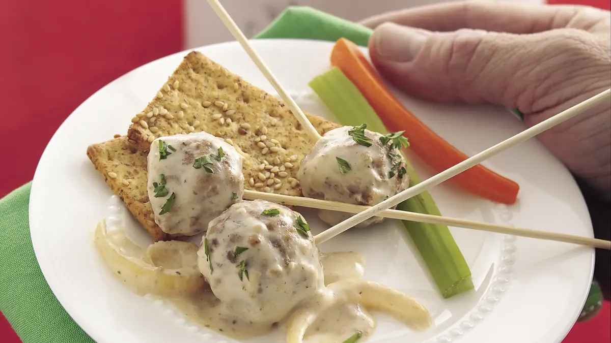 Read moreSpice up the standard meatball appetizer with creamy roasted garlic sauce and onion slices. Serve with long skewers for serving and eating ease.