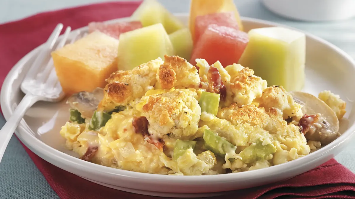 - Meanwhile, in large bowl, beat eggs, sour cream, milk, onion, 1 teaspoon salt, the nutmeg and ground red pepper with wire whisk.