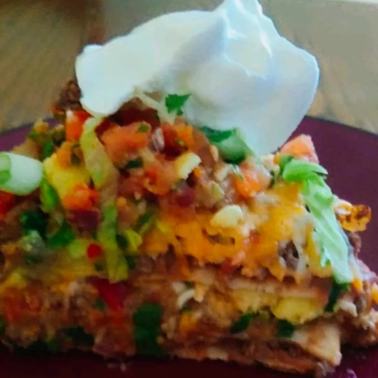 This Mexican dip for tortilla chips was given to me by my sister-in-law and always goes fast! Cream cheese at the base of the dip makes it extra thick and scoopable. Seasoned beef and vegetables make it extra filling and tasty. You may want to prepare two batches. Serve with tortilla chips.