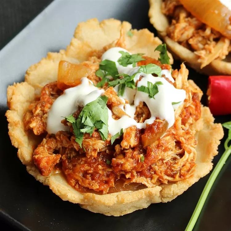 Mexican chicken tinga, or tinga de pollo, is a shredded chicken dish with tender sliced onions cooked in a spicy tomato and chipotle chili sauce. Delicious served on crunchy tostada shells topped with sour cream. This recipe is easy to make and great for feeding a crowd!