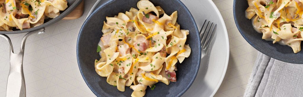 Read moreCook and drain the noodles according to the package directions. While the noodles are cooking, heat the oil in a 10-inch skillet. Add the ham and onion and cook until the onion is tender.