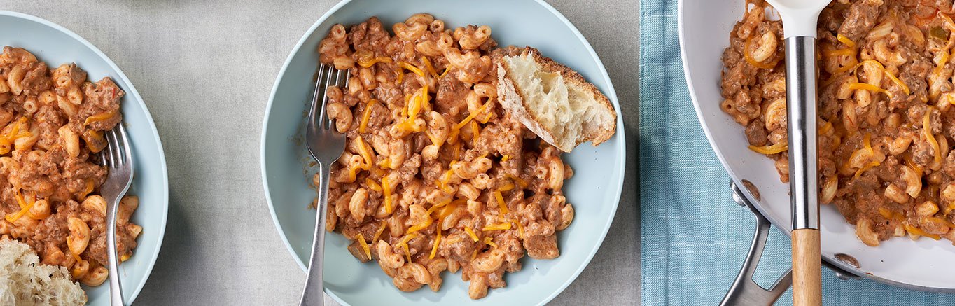 This Easy Goulash is one of those recipes where you pull a few things from your pantry, add some ground beef and it magically becomes a delicious homemade dinner. Beef and macaroni are always a good start for a family dinner, but this dish is special because of the creamy, spicy sauce. Save time by making the beefy sauce while the macaroni is cooking. Pantry staples cream of mushroom soup and picante sauce provide the magic, making this Easy Goulash ready in 2 steps and 25 minutes. Then sprinkle with shredded cheese while it's hot for a melty, cheesy topping.