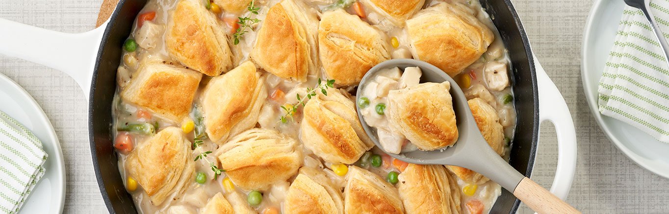 What’s the bonus of ours? 6 ingredients in 30 minutes. Cream of Chicken Soup is the star here, working as the rich, creamy foundation to the recipe with the veggies and chicken (opt for rotisserie chicken to make it even easier). Our homey version is also topped with a fluffy biscuit crust. For a larger crowd, it’s easy to double the recipe and make it in a 13x 9-inch dish (check out the recipe tips below).
