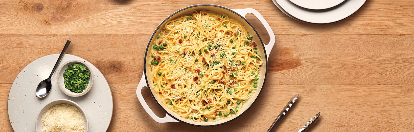Want to shortcut your way to a delicious carbonara on a weekend? This version takes only 7 ingredients and 25 minutes to a rich and creamy pasta dish that your family won’t be able to resist. The rich creaminess comes from a trusty can of