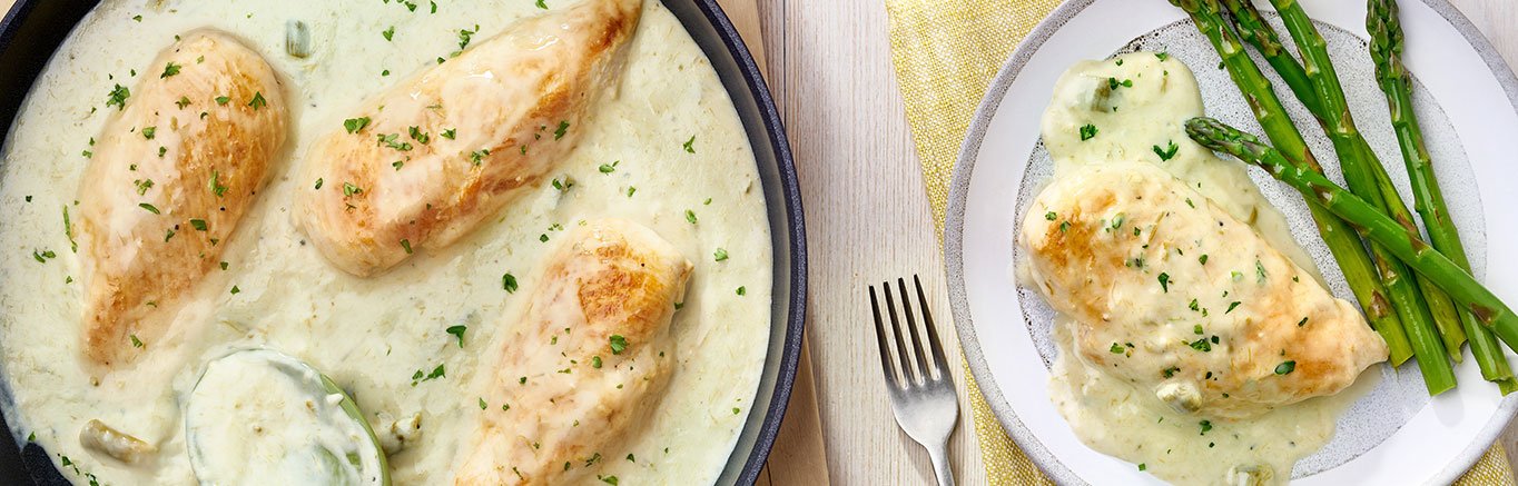 Asparagus and lemon are two classic spring flavors that are great paired with chicken. Keep some condensed cream of asparagus soup in your pantry and you can make this Lemon Asparagus Chicken anytime! The soup provides subtle asparagus flavor that becomes a creamy sauce when simmered with sauteed chicken and fresh lemon. Only 2 steps and 5 ingredients to make this Lemon Asparagus Chicken the perfect answer to the eternal question: How can I turn this package of chicken into dinner tonight?