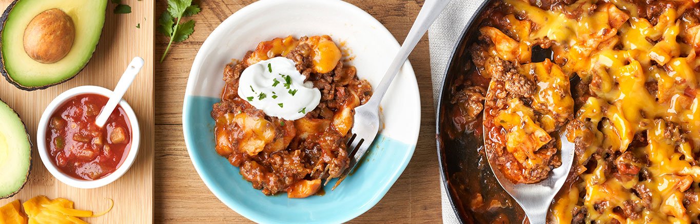 Whisk your family away on a culinary adventure to the Southwest with this effortlessly delicious Beef Taco Skillet, where every bite is a fiesta of flavors! Featuring ground beef, picante sauce, tortillas, and Cheddar cheese, it comes together with just one pan and a few simple steps- all in under 25 minutes. To get dinner on the table even faster, you can make this recipe ahead and freeze it. Why not whip up a second batch next time you make it, and pop it in the freezer to really speed up mealtime when you’re in a rush! Click on the recipe tips below to see how.
