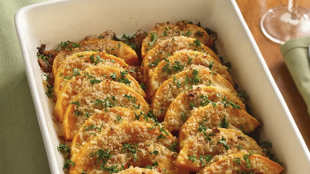 Crispy bread crumbs add a bit of crunch to tender slices of butternut squash seasoned with garlic and Parmesan, making this a can’t-miss side that even veggie skeptics adore. It’s also easy to make ahead — perfect for holiday feasts.